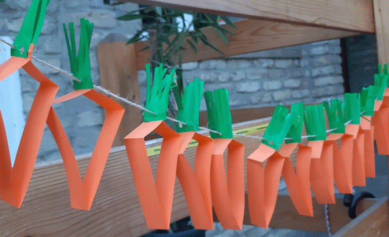 Savet: napravite manje rupe da vam trakica jedva prođe kroz njih. Na taj način ćete moći lakše da rasporedite šargarepe na gotovoj girlandi.