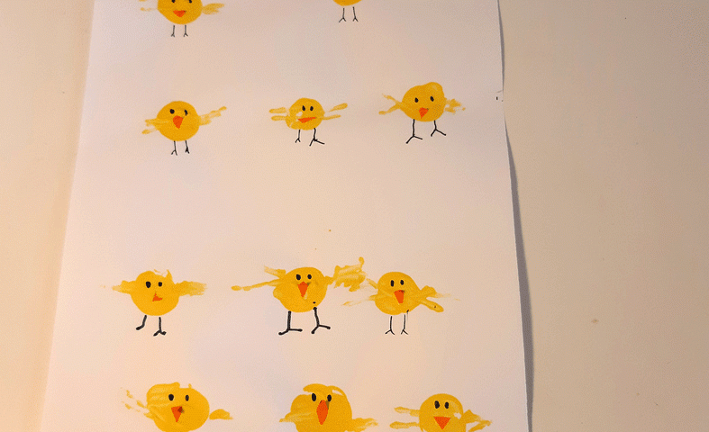 Narandžasti papir isecite na male/sitne trouglove koji će biti kljunovi pilića. Možete ih lepkom zalepiti – no, ja sam ih samo “utisnula” u telo pileta jer je Zozon naneo punooo tempere koja se nije osušila…
