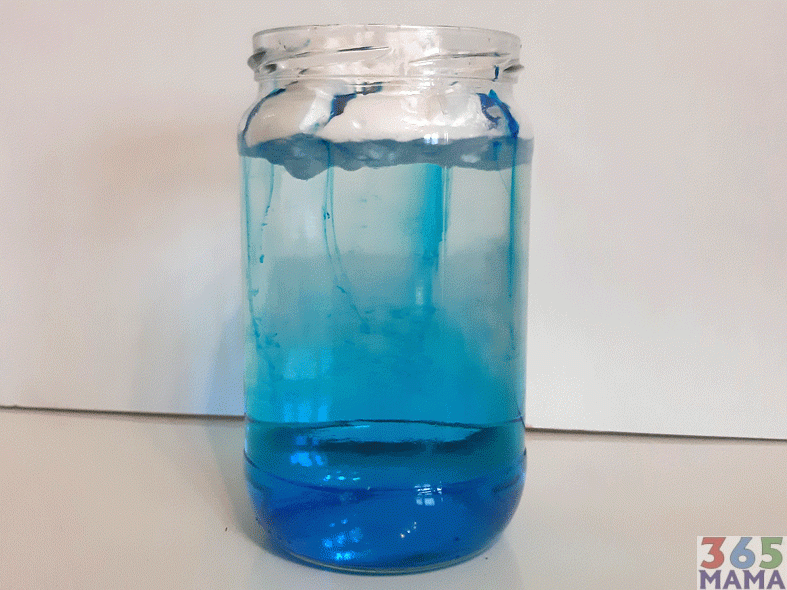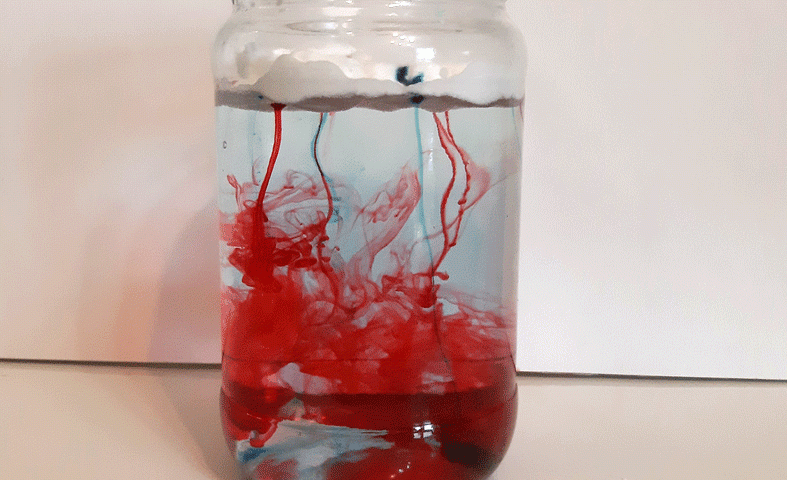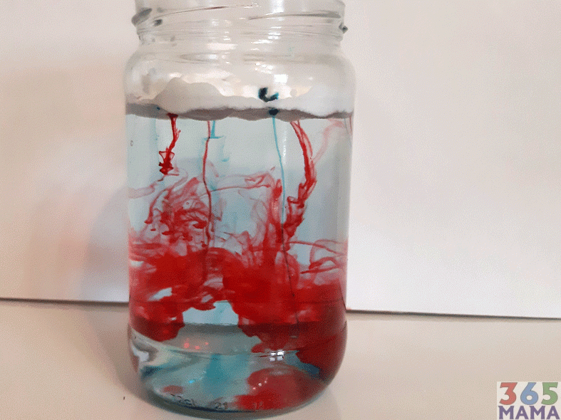Savet: prvo smo koristili boje u gelu (dr Oetker) a potom obične/tečne boje za kolače kojima ne znam ime ali sam ih pronašla u prodavnici u nedostatku prvo pomenutih. U ovom slučaju su se te tečne pokazale mnogo bolje: kapi brže “prolaze” kroz “oblak” i ostavljaju bolji/jasniji trag u vodi – formirajući lepši doživljaj.