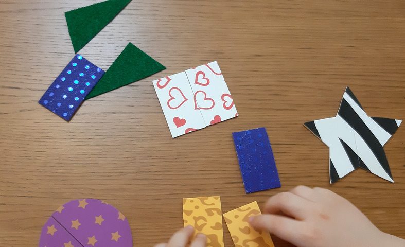 Isečete ih te svaki rasečete na pola, stavite pred dete i dopustite mu da samo spaja polovine. Pri tom pričate o oblicima, šarama, bojama…
